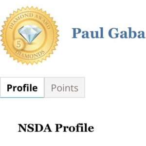 A coach’s first Diamond is earned when they receive 15,000 points and have been coaching in the NSDA for at least five years since achieving their Degree of Merit, which Gaba earned on November 16, 2000. Five years must pass between each new diamond award, and 15,000 points must be earned to receive a second diamond. An additional 30,000 points must be earned and five years must pass for each additional diamond.